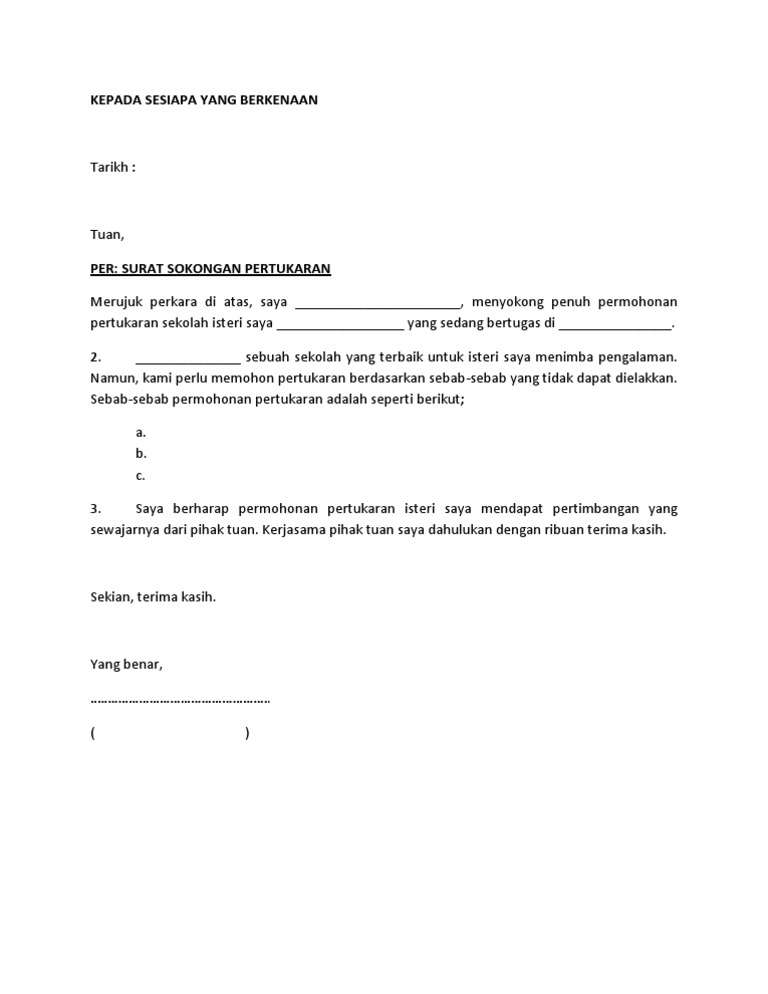 Surat pengesahan majikan sokongan pertukaran bekerja rayuan pekerja kerja jawatan kebenaran memberhentikan isteri berhenti jurnal permohonan scribdassets pelepasan koaggaj. Surat Sokongan Pertukaran Pdf 57 Di sini admin kongsikan beberapa contoh untuk anda yang tercari-cari tempat kerja yang mungkin ada masalah jauh dengan suami masalah jauh dengan orang tua masalah jauh dengan tempat tinggal masalah kewangan dan macam-macam lagi alasan. Salinan borang permohonan pertukaran online.